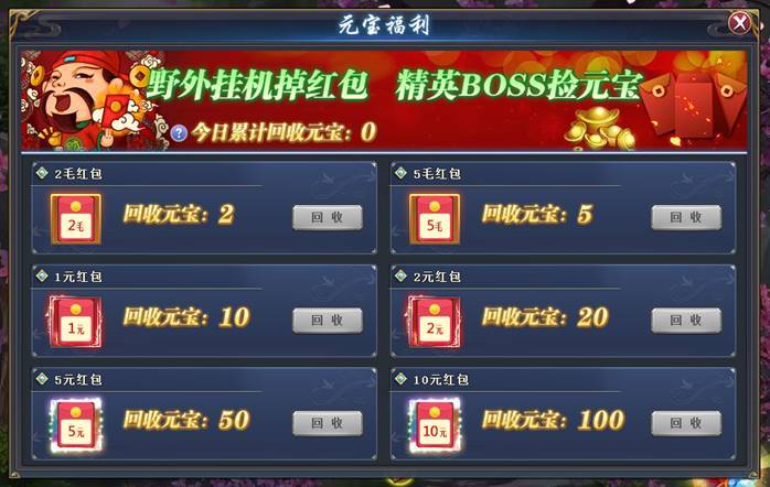 2. 收集红包可在元宝福利界面兑换充值元宝,免费薅羊毛!