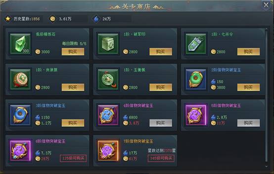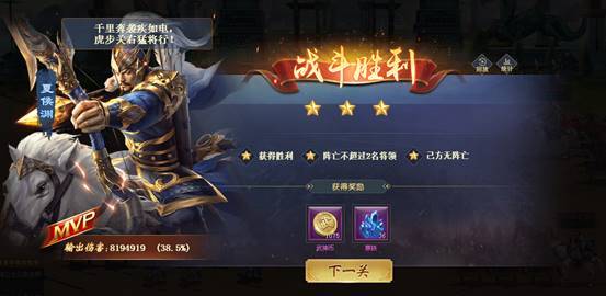 通关闯荡关卡获得的武神币,越后面关卡获得的越多。挑战成功后会有星级判断,根据存活的将领进行星级。
