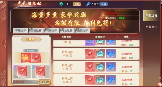 阵法达标:阵法达到对应等级可获得奖励,全服第一玩家获得超炫酷的阵法。