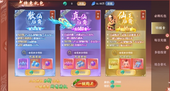 特权卡分为:散仙后裔、真仙后裔、仙王后裔。