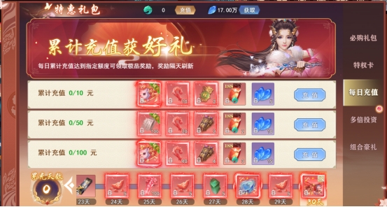 当累计充值任意金额天数到达30天会赠送一只仙宠。每天也是有丰厚的奖励。
