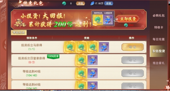 花费5000仙玉进行投资,达标后可领取对应的仙玉奖励,累计返利超高倍!