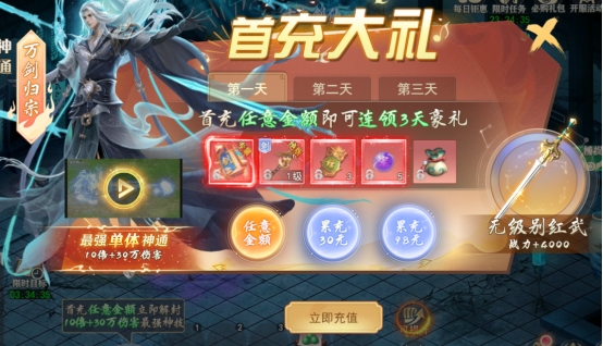 充值任意金额、30元、98元连续领取3天奖励。