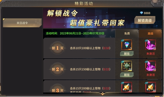 活动说明:玩家完成任务即可领取免费奖励,花费8888钻石即可领取高级奖励